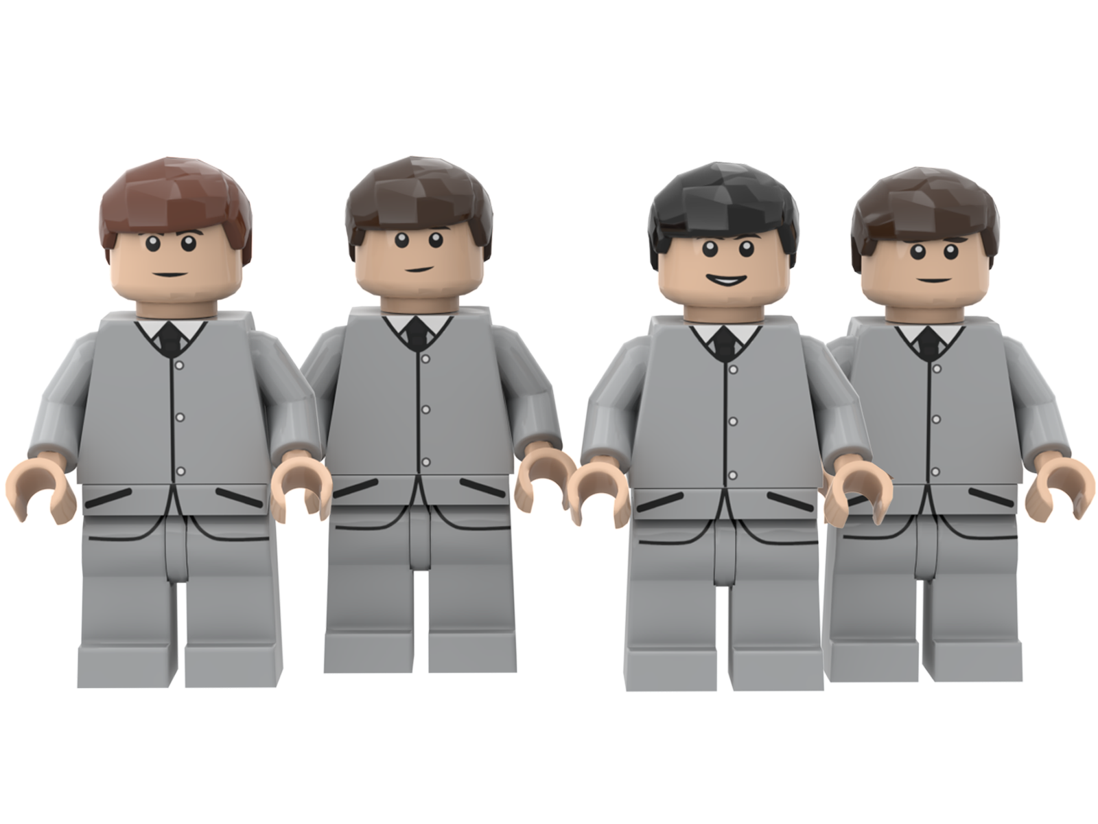 The Beatles minifigs featuring the group in their famous gray outfit from the early years.
